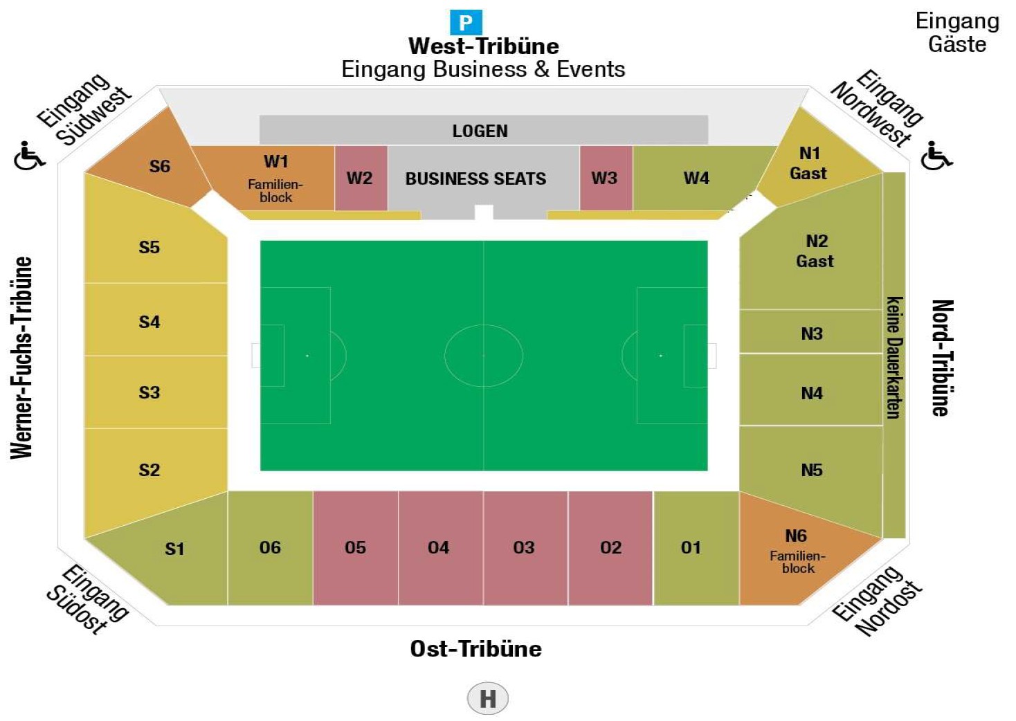 Für Gästefans sind die Blöcke N1 (Stehplatz) und N2 (Sitz- u. Kann-Sitzplatz) reserviert. Der Zugang zu diesen Blöcken ist ausschließlich über den regulären Gästeeingang möglich.