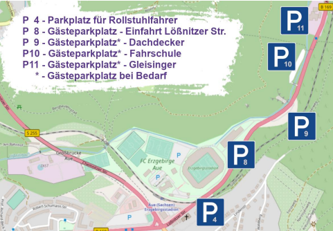 Es wird zwingend eine Anreise über die A72 Abfahrt Hartenstein empfohlen! Bitte der Beschilderung „Gäste“ folgen und dann entlang der B169 via Lößnitz zu den Gästeparkplätzen fahren! Eine Anreise per Navi wird nicht empfohlen.