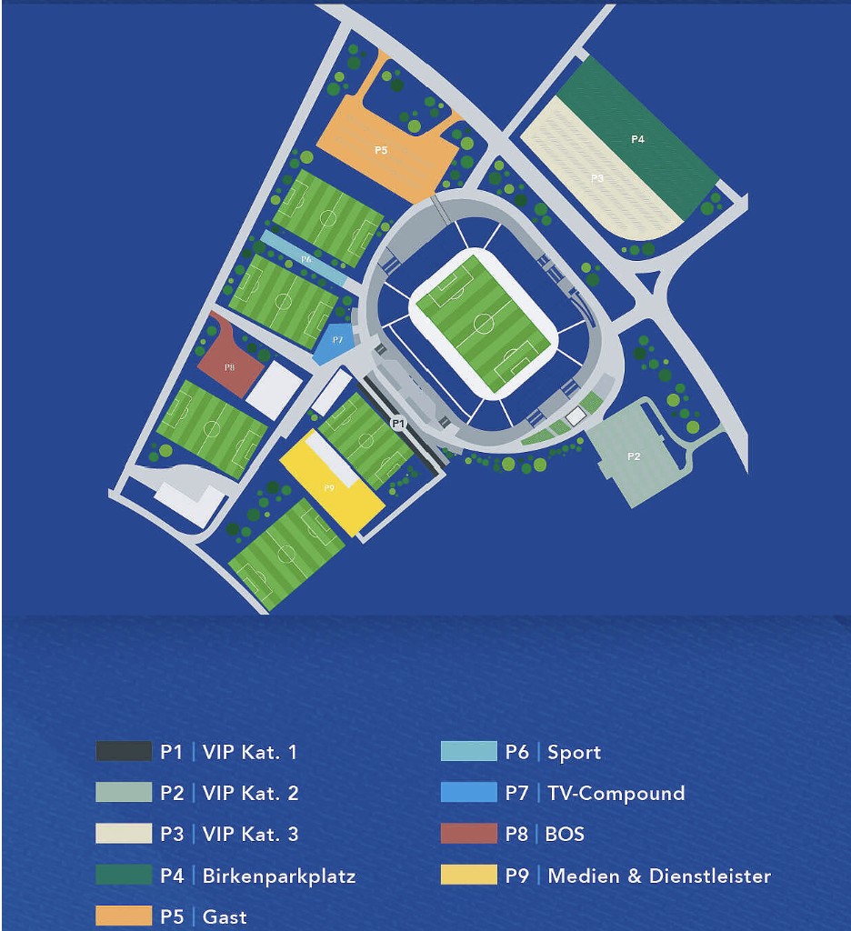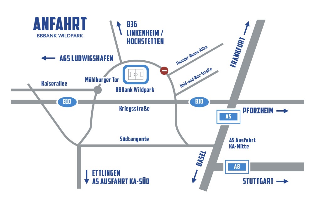 WICHTIG: Generell ist zu beachten, dass die vorgeschlagene Route eines Navigationsgerätes zum Stadion von der oben genannten Route abweichen kann. Daher bitte ausschließlich die genannte Anfahrtsroute wählen und der Beschilderung für den Gästeparkplatz (P5) zum Stadion folgen. Nur über diese Anfahrt gelangen die Gästefans zu der für sie vorgesehenen Gästeaufstellfläche am BBBank Wildpark.