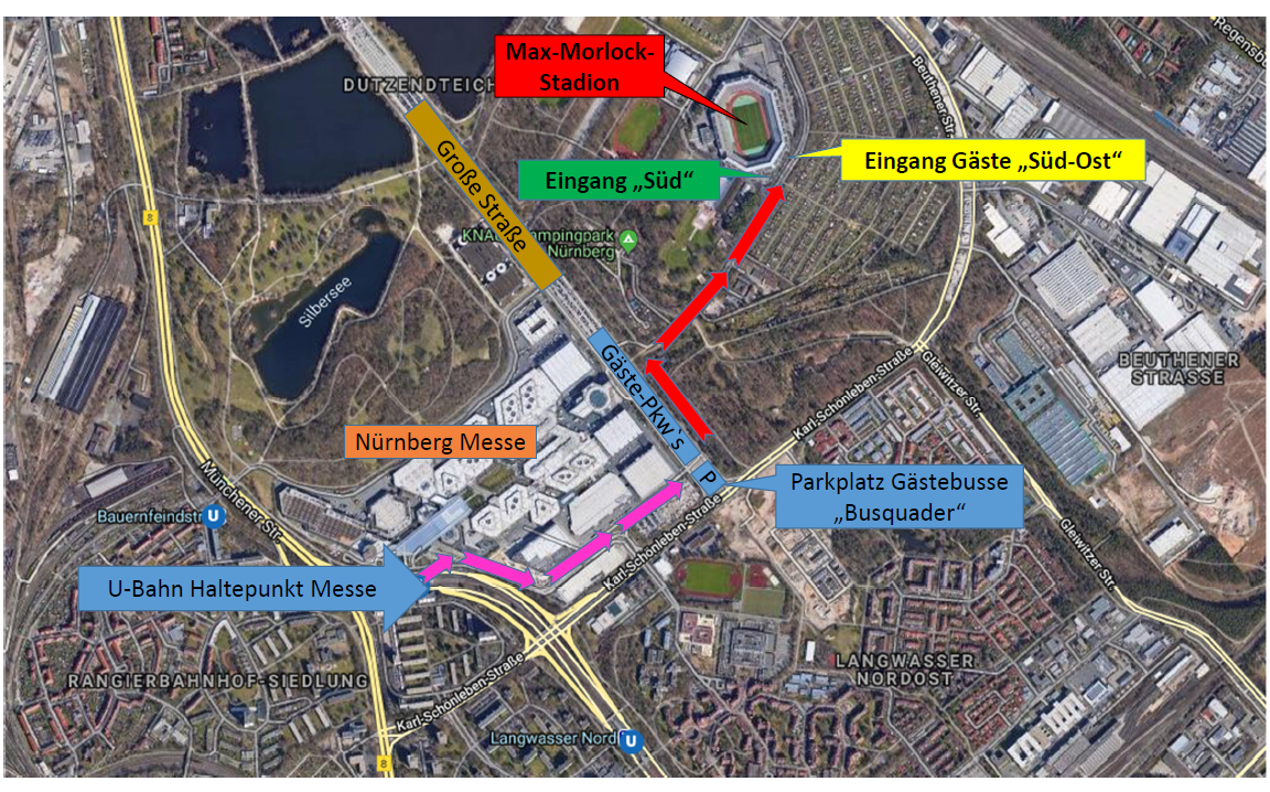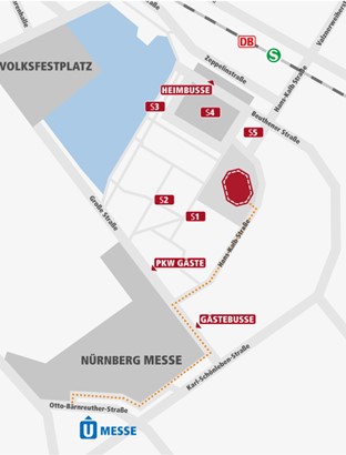 Für alle Fan-Busse (15,-€) und Pkw-Fahrer (5,-€) empfehlen wir den Parkplatz „Große Straße“. Der Parkplatz ist ab der Autobahn (Kreuz Nürnberg oder BAB-Ausfahrt N-Fischbach) über das Verkehrsleitsystem beschildert. Einfach der Beschilderung „Gäste“ folgen.