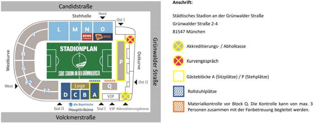 Das Stadion öffnet um 12:30 Uhr. Der Gästebereich umfasst die Blöcke A (Sitzplätze) und P (Stehplätze). Die Gästeeingänge sind am Eingang SÜD I (Sitzplätze) und OST II (Stehplätze).