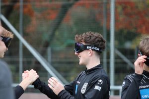 Die SSV-Spieler bekamen eine Brille aufgesetzt, mit der sie die Blindheit nachempfinden können. Dann geht es auf einem kleinen Feld im fünf gegen fünf um Tore. Die Orientierung erfolgt über Kommandos von außen sowie anhand eines „Akkustikballs“, der mit Rasseln gefüllt und hörbar ist.