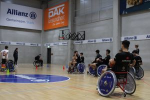 Es war eine besondere Erfahrung für die U17 Mannschaft, als sie am 02.11. die Gelegenheit bekam, Rollstuhlbasketball mit Andre Penner, Andrej Michalski und Jannis Hohl, den Spielern der 2. Bundesligamannschaft der BBU’01 Allianz Rollers Ulm zu spielen. Die SSV-Spieler waren begeistert von der ihnen ganz neuen Sportart, die ihnen viel Spaß machte und ihnen auch etwas über das Leben mit Behinderung lehrte. Die Aktion wurde von Anouk Eichelberger von BBU’01 angeleitet von den Präventionsbeauftragten im SSV-NLZ, dem Sportpsychologen Markus Gretz und dem pädagogischen Leiter Peter Trefzger organisiert. Die 15- und 16-jährigen waren beeindruckt von der Leistung und dem Engagement der Rollstuhlbasketballer und nutzten die Möglichkeit sich Tipps für’s Spiel abzuholen und Fragen zu stellen. Wir danken Astrid Bick und dem ganzen Team der Allianz Rollers Ulm für die spannende Erfahrung und das tolle Projekt.