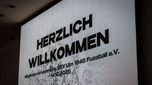- 14.12.2025 09:05Herzlich willkommen zum Liveticker zur Mitgliederversammlung 2025 des SSV Ulm 1846 Fußball e.V.Die Versammlung startet heute um 11:00 Uhr im Kleinen Donausaal der Messe Ulm. Der Liveticker begleitet euch mit allen Entwicklungen, Informationen und Entscheidungen der Mitgliederversammlung.